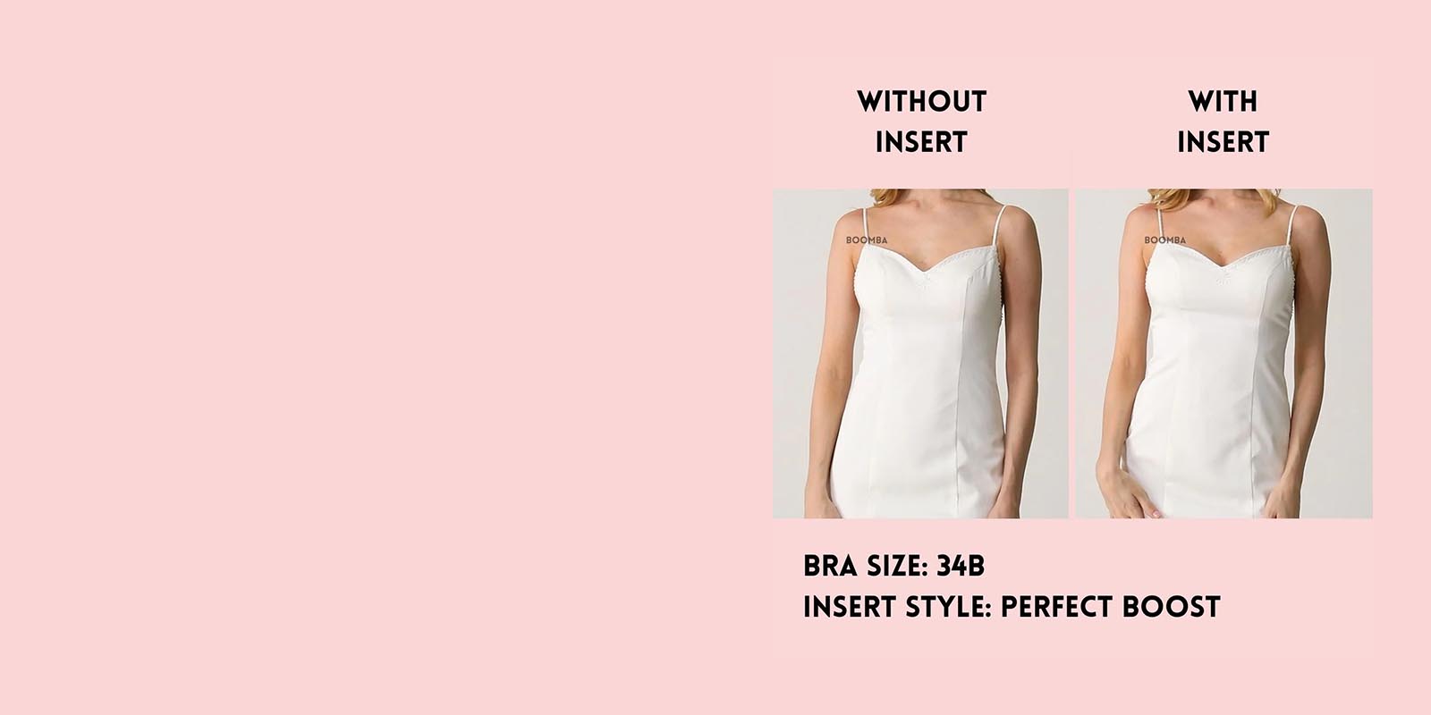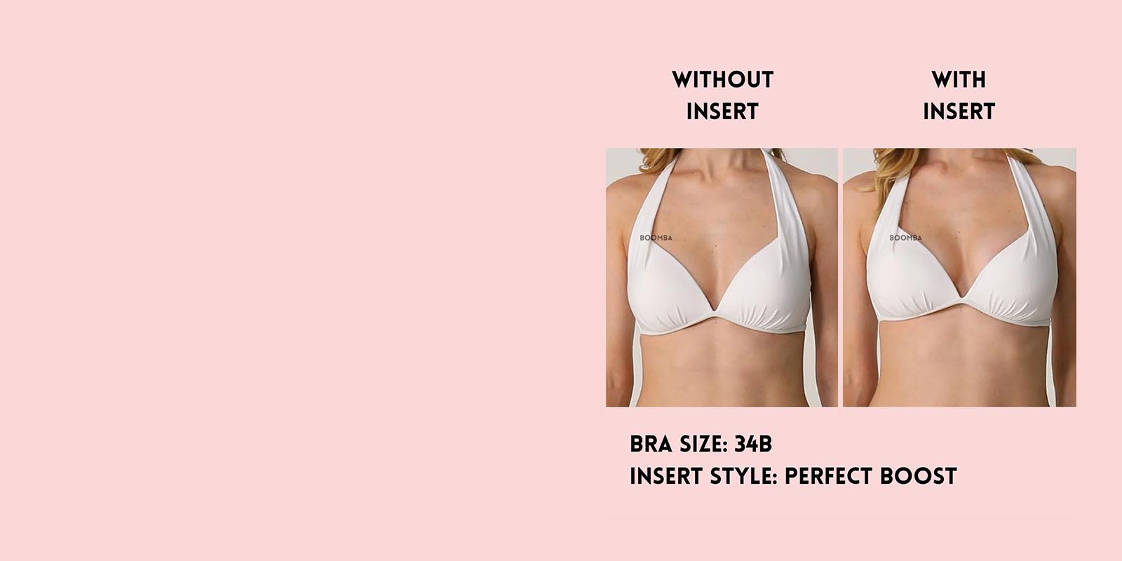 Please note that results may vary depending on breast size and shape. Results will be similar to a double push-up bra. BOOMBA results work best with natural breasts. Demi Boost & Invisible Lift Inserts come in two sizes (small and medium). Size small is suitable for cup sizes A / B / C and size medium is suitable for sizes D / E and Ultra Boost Inserts come in different cup sizes.